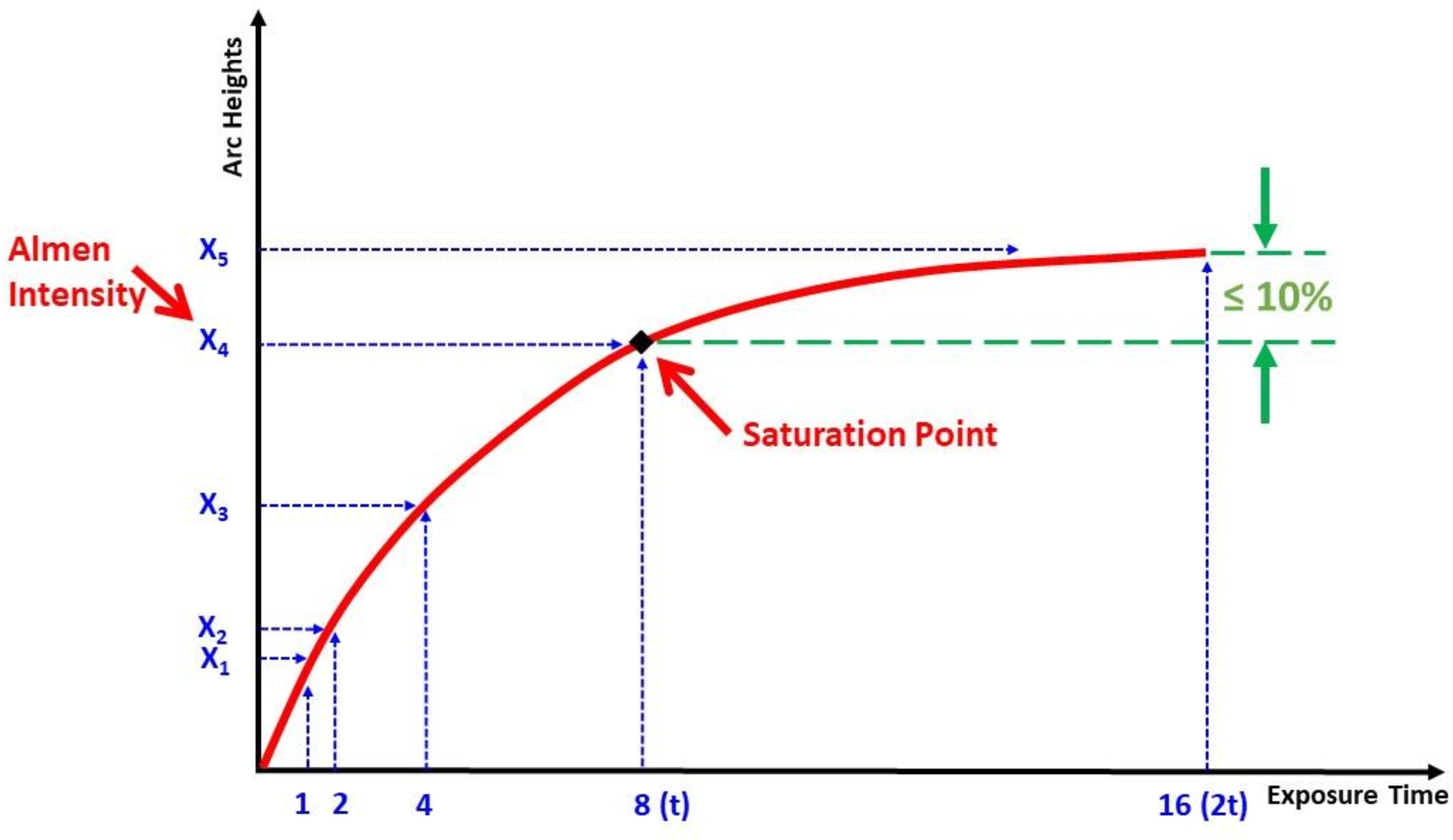 飽和強度的定義為當珠擊時間T 加倍而弧高H 的增加量為10%時在曲線上所得到的位置即為飽和強度,此方式為業界標準的定量。 珠擊強度曲線是一個“連續函數”並且具有將弧高與珠擊時間相關的相應方程式。 使用標準化量具和程序隨著珠擊時間來監控弧高的變化。 |