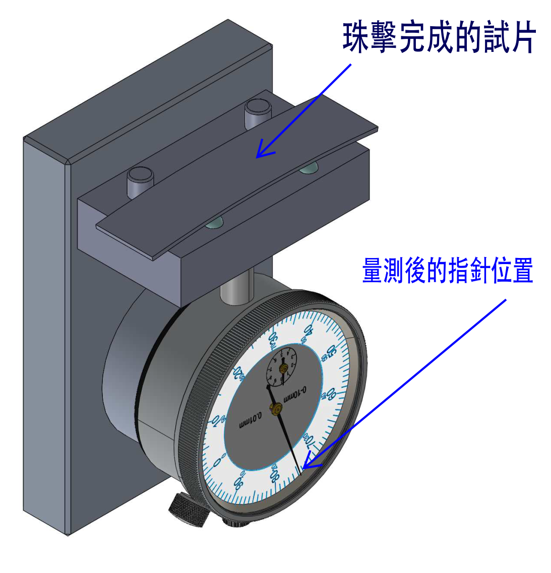 接著把亞侖試片 Almen strip 利用試片固定座上的四個螺絲鎖緊在固定座上,再利用噴氣式或輪甩的方式將介質均勻的推送到試片上,借用介質的動能將能量轉換到試品上,使試品產生應變的變化,當珠擊作業完成後因試片被固定在固定座上所以還是處於平整的狀態,量測時將固定座上的四個螺絲放鬆(螺絲要多鬆開一點),此時試片會因應變能的關係在珠擊面上型成凸型的圓弧狀,取出試片再次的放在量規上,同樣的要對正。 測量時,將珠擊後的試片放入 Almen 量規中,確保測量時不受外力影響,然後讀取試片的 弧高度(Arc Height,mm 或 inches)。此數值即代表珠擊強度,並將其作為後續飽和曲線分析的依據。如果數字為25即代表此試片的對應值為 0.025,在亞侖試片內容中有提到 "A"、"C"、"N" 三種Almen strip 此時如果是 "A" 代號試片即將 A 代入即成為 0.025 A此時要注意量規的單位,如果是英呎的數字後面要加上英吋的代號即為 0.001" A,如果是公制的可以不用加代號代號沒看對可是差很多的喔! |