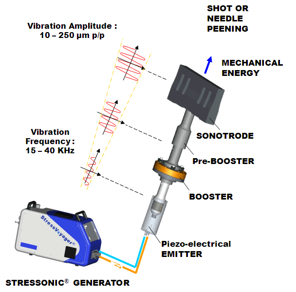 超音波,這是近十多年來發展出的新的珠擊設備,以每秒20K-40K次的震波來做為動能的來源,運用介質的彈性在加工元件及震動頭間做來回反覆的衝擊元件表面達到珠擊的效果。